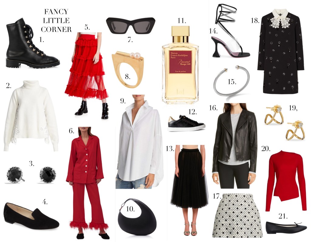 To shop: 1. Black combat boots // 2. White turtleneck sweater // 3. Black round earrings // 4. Black loafers // 5. Red midi skirt // 6. Red feather trim pajama set // 7. Black sunglasses // 8. Gold pearl ring // 9. White shirt // 10. Black bag // 11. Perfume // 12. Black sneakers // 13. Black tulle skirt // 14. Black lace-up sandals // 15. Cable bracelet //16. Black leather jacket // 17. Tweed dot mini skirt //18. Embellished collar shift dress // 19. Gold earrings //20. Red sweater // 21. Black ballet flats